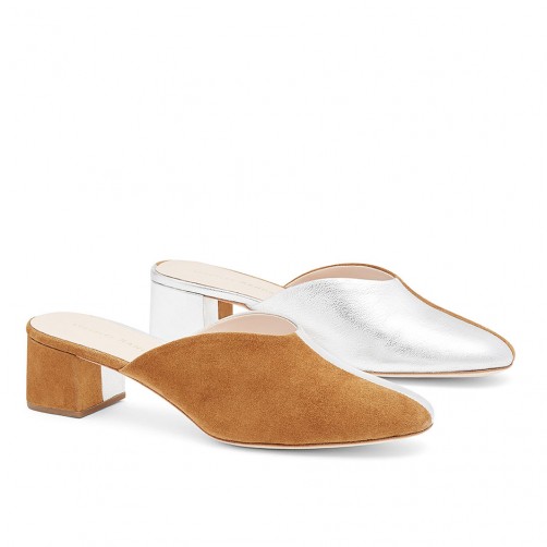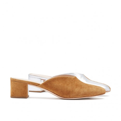 Square toe mule in camel kid suede and silver metallic goat split 1.8in / 45mm heel and leather sole