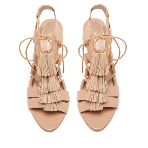 Lace-up sandal in wheat vachetta with tassels 3.5in / 90mm stacked leather heel and leather sole